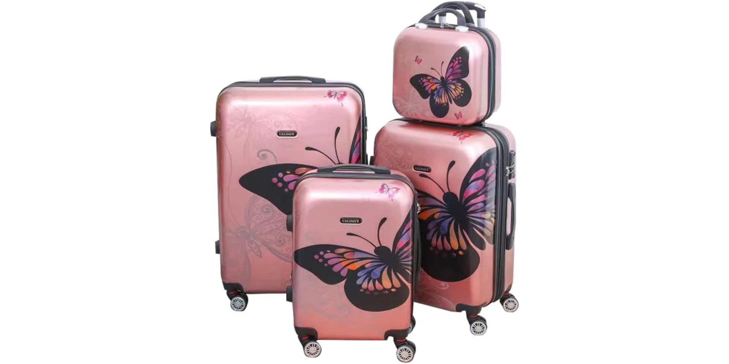 4-teiliges Polycarbonat-Kofferset – Roségoldener Schmetterling (Kabine, mittel, groß + Kosmetikkoffer)